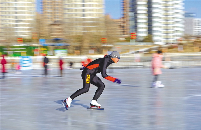 呼和浩特市东河,冰雪运动爱好者一展身手。