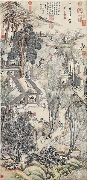 明代画家李士达的《岁朝村庆图》现藏于故宫博物院,纸本设色,纵132.9厘米,横64厘米,描绘的是山村人家欢欢喜喜过大年的热闹景象。远处山岭起伏、碧水涟漪,近处溪流淙淙、板桥飞架。溪水左岸苍松翠柏挺拔参天,枝条下垂,红叶藤枝攀援而上,预示着紫气东来。图中所画人物众多,身姿各异,神态生动。
