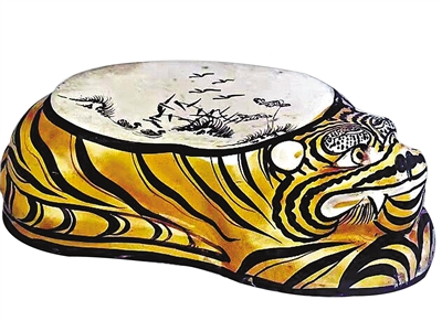 这只八义窑瓷虎枕是山西长治八义窑红绿彩博物馆镇馆之宝。瓷虎枕呈腰圆形,高8.5厘米、长29厘米,枕面前低后高,角度圆润又柔和,满足了人体枕眠舒适的需求。虎枕外形像一只匍匐在地的老虎,憨态可掬,眉毛粗浓,双目圆睁,阔口露齿,尾巴自然地弯曲在腹部,生动有趣。身上虎纹斑斓,用一粗一细的线条搭配勾勒而成,装饰感与写实性浑然一体,相映成趣。虎枕古朴典雅、稚拙可爱,厚实而不失法度,简洁又不乏诗意。最为精妙的是虎枕的排气孔与虎鼻孔巧妙结合在一起,体现出民间工匠的想象力和创造力,是宋金时期陶瓷虎枕杰出代表。