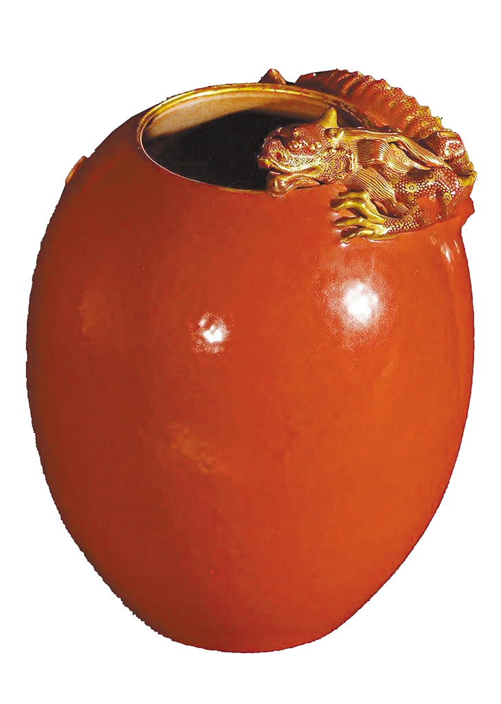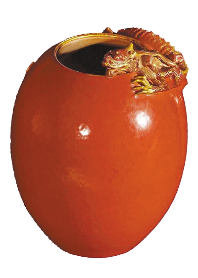 这件清代乾隆时期的珊瑚红地贴塑螭龙纹罐是珊瑚红釉瓷的典型代表。此罐为我国著名收藏家戴福葆先生的收藏,罐高17.5厘米,圆口微收,鼓腹,圈足,通体以吹釉法施彩,施釉薄而细匀,无刷釉痕迹,故而色调沉着含蓄,光润艳美,给人以喜庆吉祥之感。罐上贴塑螭龙于口沿,四爪尖利、昂首曲身,造型颇具肌肉感,似即将腾起,动势内蕴,傲视来者。以珊瑚红釉为地,其上以金彩点描涂染,毛发鳞片依次展现,金灿吉庆,凸显堂皇富丽之感。器底亦施红釉,有“大清乾隆年制”六字三行金彩篆书款。