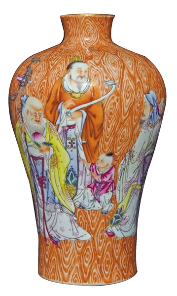 文中的木纹釉粉彩福禄寿三星人物梅瓶高22厘米,腹径13厘米,小口、短颈、丰肩 、瘦底、圈足,造型挺秀而俏丽。瓶身通体施木纹釉,正面以福、禄、寿三星人物为主题纹饰,画工细腻流畅,衣纹飘逸自然,人物栩栩如生。福星居右,怀抱童子,气韵轩昂;禄星居中,腰围玉带,手持如意;寿星居左,鹤发童颜,右手扶杖,左手捧桃。三星之外,尚有祥云、仙鹤、童子等,无不栩栩如生,喜庆、祥和的气氛跃然瓷上。