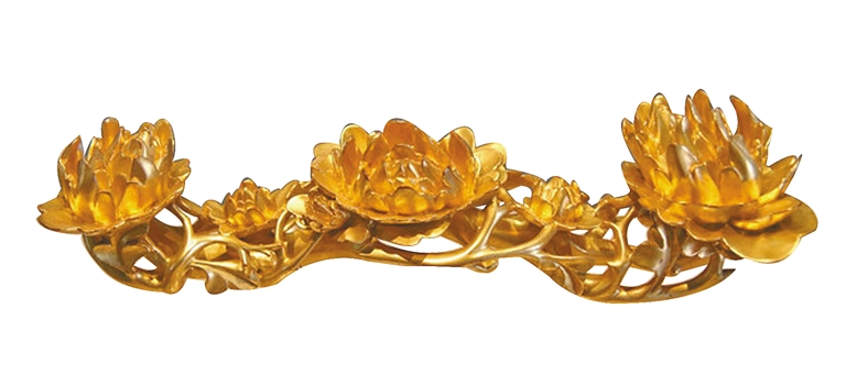 金漆木雕又称潮州金漆木雕,是广东潮州汉族传统雕刻艺术之一,始于唐,盛于宋,明清时达到顶峰,主要用于建筑装饰和家具装饰。此件金漆木雕牡丹如意,雕刻精细、造型优美,是潮州金漆木雕的典型代表,集中展示了古代工匠的高超技艺,并遍涂金光闪闪的油漆,给人以富贵、财旺的感觉,雍容华贵的牡丹,更赋予其富贵吉祥的寓意。