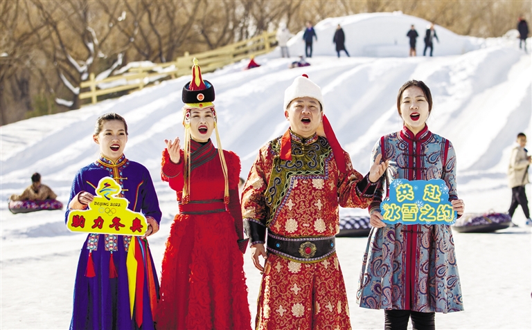 1月28日,呼和浩特市第六中学的乌兰牧骑小分队队员在快闪活动上演唱北京冬奥会歌曲《冰雪冬奥》。当日,该中学的乌兰牧骑小分队来到青城公园公益冰雪场,举行“唱响冬奥旋律 助力北京冬奥”快闪活动。伴随着欢快的节拍,队员们唱响北京冬奥会歌曲《冰雪冬奥》《向世界微笑》《燃烧的雪花》,表达他们对北京2022年冬奥会的期待之情。本报记者 王磊 摄