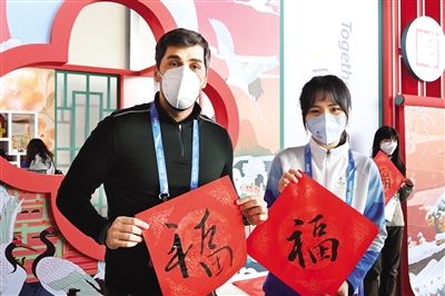 1月31日,参观者里卡多·卡瓦略(左)与志愿者王雯飞展示他们写的福字。当日,位于北京冬奥会主媒体中心二层的“北京故事”展厅举行迎新纳福民俗活动,迎接农历新年到来,吸引众多工作人员、志愿者以及媒体记者前来参观体验。