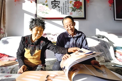 翻看儿子儿媳的婚纱照,老两口一脸幸福。