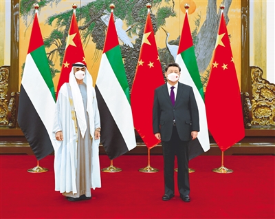 习近平指出,近年来,中阿关系保持高水平发展,成为中国同中东国家关系典范。双方深入开展抗击新冠肺炎疫情合作,克服疫情不利影响稳步推进各领域务实合作。中方视阿联酋为好朋友、好伙伴、好兄弟,愿同阿方一道,把握两国友好大方向,打造面向新时代的中阿全面战略伙伴关系。
