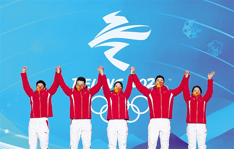 2月6日,中国队选手范可新、任子威、曲春雨、武大靖、张雨婷(从左至右)在奖牌颁发仪式上。当日,北京2022年冬奥会短道速滑混合团体接力奖牌颁发仪式在北京赛区颁奖广场举行。新华社记者 鞠焕宗 摄