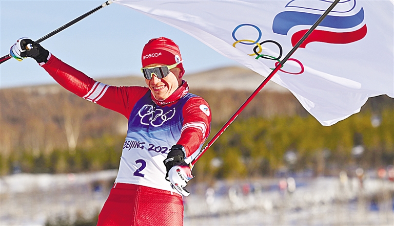2月6日,俄罗斯奥委会选手亚历山大·博利舒诺夫夺冠后庆祝。当日,北京2022年冬奥会越野滑雪男子双追逐(15公里传统技术+15公里自由技术)比赛在国家越野滑雪中心举行。俄罗斯奥委会选手亚历山大·博利舒诺夫获得冠军。