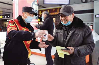 近日,包头铁路公安处民警在候车室为旅客发放贴有防骗反诈小贴士的“反诈红茶”,提醒旅客提高防范意识,守好自己的“钱袋子”。