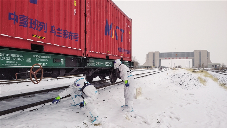 近日,二连浩特市出现强降雪降温天气,二连出入境边防检查站民警风雪中不畏严寒,始终坚守在国门口岸一线,严格落实疫情防控要求,扎实做好出入境列车查验工作,确保口岸通关高效顺畅。杨金烨 摄