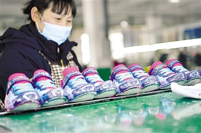 2月9日,务工人员在湖北省宣恩县椒园镇一家鞋业企业的车间生产线上劳作。春节假期过后,全国各地众多工厂企业铆足“虎劲”,积极复工复产,力争“开门红”。 新华社发