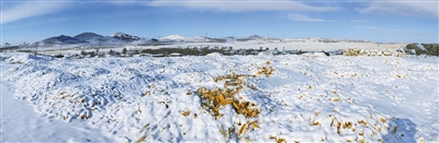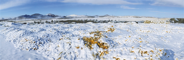 突泉县东杜尔基镇杜胜村玉米丰收,南山坡上的玉米棒堆积如山,大雪过后,宛若银山,蔚为壮观。文/图 特格喜