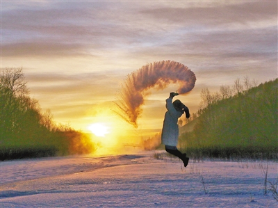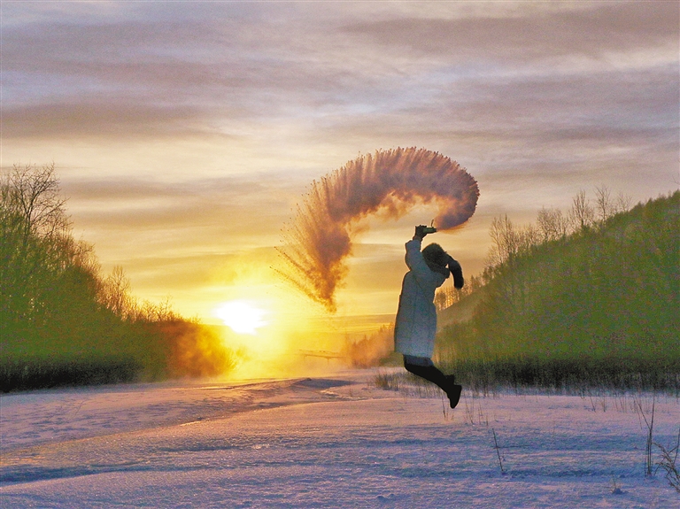牙克石市塔尔气镇绰尔河畔,一位游人体验泼水成冰的乐趣。