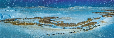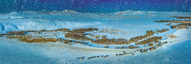 陈巴尔虎旗,夕阳西下,瑞雪飘飘,冰河蜿蜒,肥牛归圈,如诗如画。