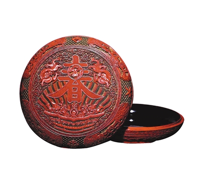 特点:捧盒器型硕大,圆口凹足、盖略隆起,俗称“蒸饼式”盒。盒体表面施以各色剔彩,有朱红,暗红,墨绿诸色之多,雕琢纹饰图案。捧盒盖面圆形开光,锦地上雕聚宝盆,盆内发出万道霞光,霞光之上托“春”字;“春”字上部中心饰圆形开光,内居寿星,端坐松下,仙鹿卧于一旁,寓意春寿之意,“春”字两侧腾龙于如意云海之中。盖及盒壁斜格锦地上各饰四组开光,内分别雕《洗桐图》《邀月图》《采菊图》《米芾拜石图》《羲之爱鹅图》《抚琴图》《植竹图》《听溪图》,以杂宝纹相间。上下口沿环饰灵芝纹一周,足壁雕回纹,器内壁及圈足内髹黑漆。捧盒雕工繁复,层次清晰,工匠运刀如笔,犀利准确细致。
