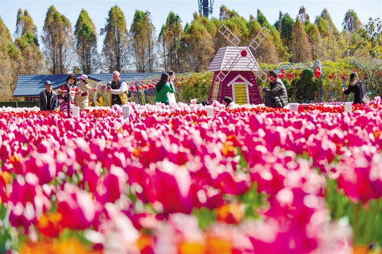 2月10日,游客在昆明捞鱼河湿地公园内观赏郁金香。近日,云南昆明捞鱼河湿地公园内23个品种约100万株郁金香进入盛花期,吸引不少市民游客前来赏花。 新华社记者 陈欣波 摄