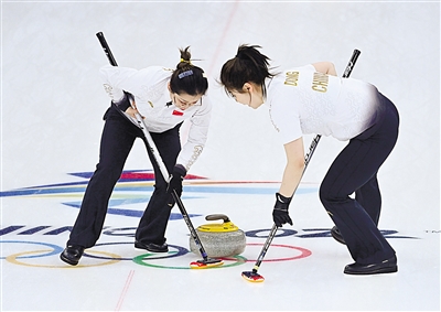 2月10日,中国队选手董子齐(右)、王芮在比赛中。当日,在北京国家游泳中心“冰立方”举行的北京2022年冬奥会女子冰壶循环赛中,中国队以6比7不敌丹麦队。 新华社记者 黄孝邦 摄