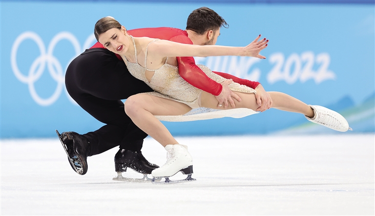 2月14日,法国选手加布丽埃拉·帕帕达基斯(前)和纪尧姆·西泽龙在比赛中。当日,北京2022年冬奥会花样滑冰冰上舞蹈自由舞比赛在首都体育馆举行。法国组合布丽埃拉·帕帕达基斯和纪尧姆·西泽龙获得花样滑冰冰舞项目的金牌。 新华社记者 兰红光 摄
