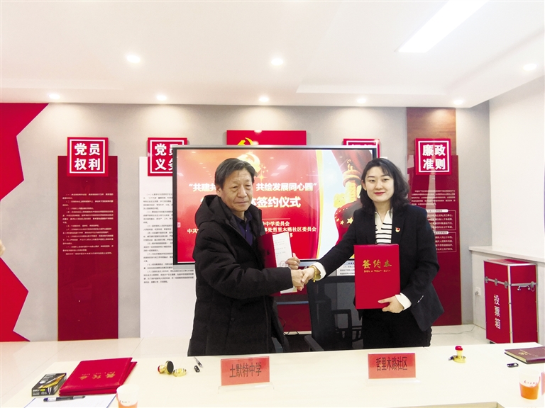 党建联合体成员单位签署共建协议书。近日,呼和浩特市新城区海拉尔路街道哲里木路社区联合呼和浩特市土默特中学、武警呼和浩特市支队执勤21中队、海东路派出所成立“共建共享聚合力 共绘发展同心圆”党建联合体,持续推动基层党组织建设深度融合、整体提升。本报记者 郝佳丽 摄