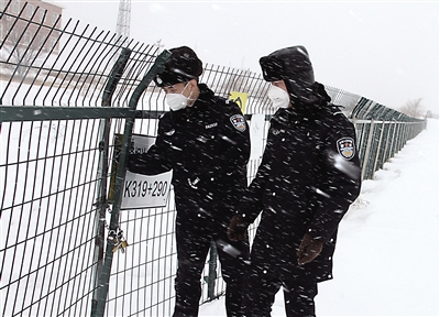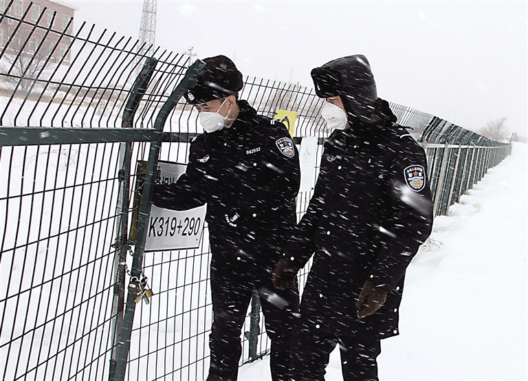 近日,锡林郭勒盟正蓝旗突降暴雪,面对暴雪天气,桑根达来车站公安派出所对管内铁路线路加大巡查力度,对踏雪进入车辆无法驶入的区域,认真检查铁路防护网,排查线路隐患,全力确保铁路运输安全。本报记者 马建荃 通讯员 王新龙 摄
