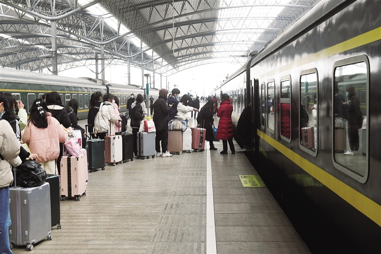 2月16日,在安徽省阜阳火车站内,旅客有序进站乘车出行。当日是元宵节后第一天,各地铁路迎来节后客流出行高峰。