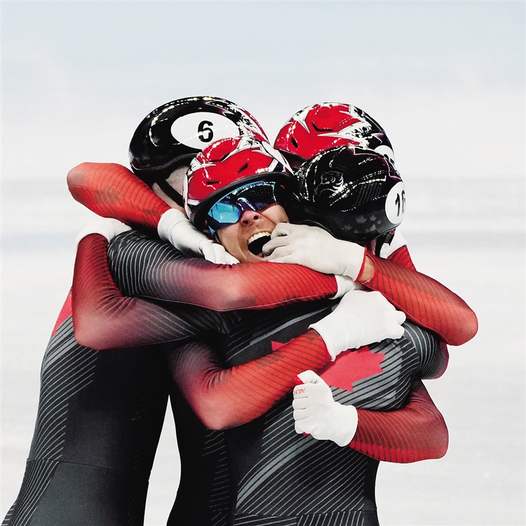2月16日,加拿大队选手庆祝夺冠。当日,北京2022年冬奥会短道速滑项目男子5000米接力决赛在首都体育馆举行,加拿大队获得冠军。