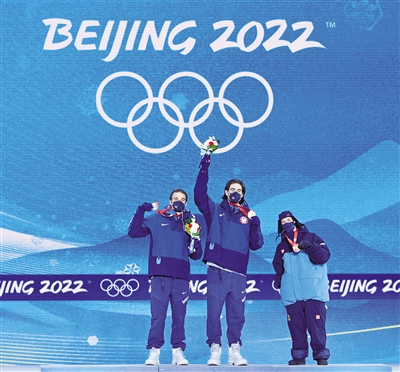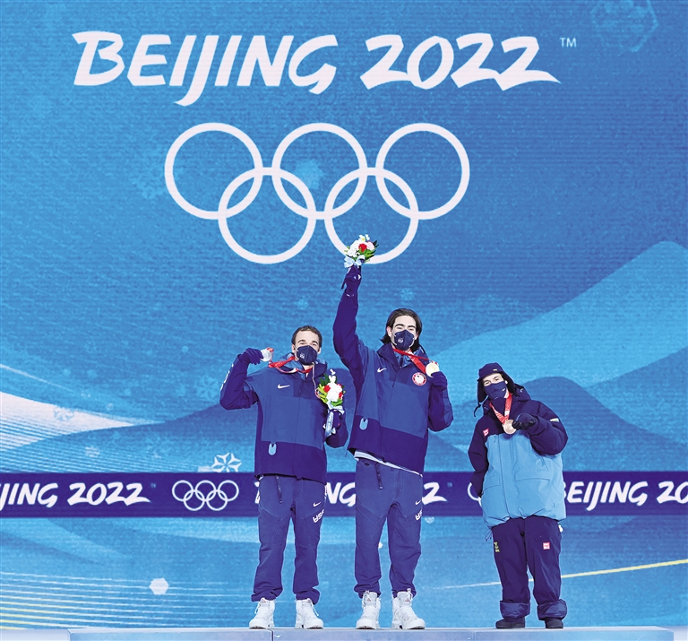 2月16日,冠军美国选手亚历山大·霍尔(中)、亚军美国选手尼古拉斯·戈珀(左)和季军瑞典选手耶斯佩尔·谢德在奖牌颁发仪式上。当日,北京2022年冬奥会自由式滑雪男子坡面障碍技巧奖牌颁发仪式在张家口赛区颁奖广场举行。新华社记者 戴天放 摄