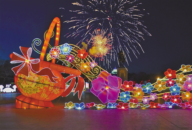 乌兰浩特市罕山公园,烟花绽放,夜空添彩;“百花盈篮”,宛如春至。 文/图 秦魁