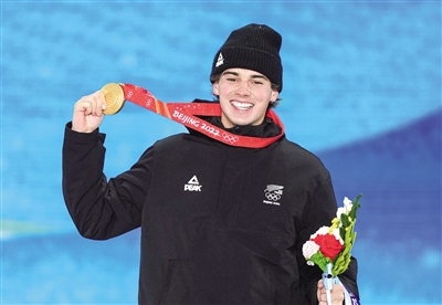 2月19日,冠军新西兰选手尼科·波蒂奥斯在奖牌颁发仪式上。当日,北京2022年冬奥会自由式滑雪男子U型场地技巧奖牌颁发仪式在张家口赛区颁奖广场举行。 新华社记者 薛玉斌 摄