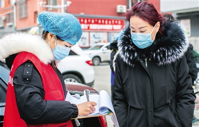 2月17日,在呼和浩特市玉泉区清泉街社区核酸采样点,党员志愿者在登记市民信息。当日,玉泉区各大社区陆续开启核酸检测工作,党员干部和志愿者不畏严寒坚守岗位,全力为居民服务。本报记者 郝佳丽 通讯员 丁根厚 摄