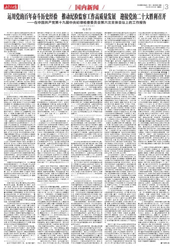 党的十九届六中全会全面总结党的百年奋斗重大成就和历史经验,向全党发出为实现第二个百年奋斗目标、实现中华民族伟大复兴的中国梦而不懈奋斗的伟大号召,为深入推进新时代党的自我革命、全面从严治党指明了前进方向。各级纪检监察机关要深入学习贯彻党的十九届六中全会精神,深刻认识“两个确立”的决定性意义,深刻理解把握党的百年奋斗历史经验、历史规律,自觉掌握运用辩证唯物主义和历史唯物主义的方法论,巩固拓展党史学习教育成果,不断深化对以伟大自我革命引领伟大社会革命、以伟大社会革命促进伟大自我革命的规律性认识,一以贯之学习贯彻习近平新时代中国特色社会主义思想,一以贯之督促推动全党增强“四个意识”、坚定“四个自信”、做到“两个维护”,一以贯之贯彻落实全面从严治党战略方针,高质量做好正风肃纪反腐各项工作,有力有效服务保障现代化建设大局。