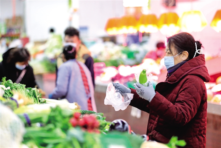 2月25日,市民在选购新鲜蔬菜。据了解,呼和浩特市生活必需品库存充足、价格稳定,4家大型农贸批发市场蔬菜日均进货量在1200吨左右,再加上政府储备菜、本地菜的补充和其他渠道的进货,可以保证市场正常供应;米面油日均进货量在600吨以上,市场库存能够保证3个月的正常供应;肉蛋的日均进货量在100吨以上,市场库存能够保证20天以上的正常供应。本报记者 孟和朝鲁 王磊 摄
