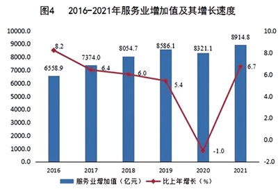 全年批发零售和住宿餐饮业增加值1874.6亿元,比上年增长4.9%;交通运输、仓储和邮政业增加值1262.4亿元,增长9.3%;金融业增加值898.4亿元,增长3.8%;房地产业增加值860.5亿元,增长2.5%。全年规模以上服务业企业营业收入比上年增长4.6%。