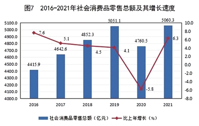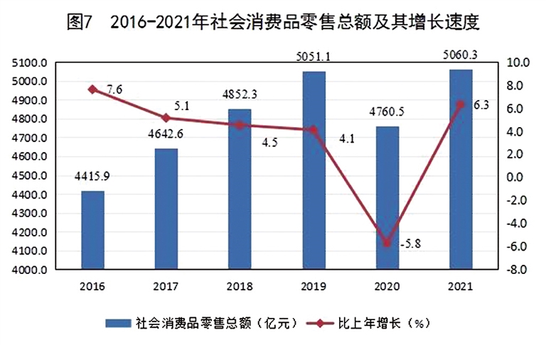 全年社会消费品零售总额5060.3亿元,比上年增长6.3%。按经营地统计,城镇消费品零售额4471.3亿元,增长6.3%;乡村消费品零售额589.0亿元,增长6.2%。按消费类型统计,商品零售额4414.6亿元,增长5.6%;餐饮收入额645.7亿元,增长11.2%。分区域看,东部地区社会消费品零售总额增长5.6%,中部地区社会消费品零售总额增长7.0%,西部地区社会消费品零售总额增长4.2%。