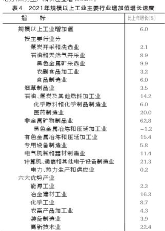 全年全部工业增加值比上年增长6.5%。其中,规模以上工业增加值增长6.0%。在规模以上工业中,分经济类型看,国有控股企业增加值增长4.8%,股份制企业增长6.1%,外商及港澳台商投资企业增长5.3%。分门类看,采矿业增长3.4%,制造业增长11.3%,电力、热力、燃气及水生产和供应业增长1.3%。分行业看,煤炭开采和洗选业增长2.1%,食品制造业增长6.0%,石油、煤炭及其他燃料加工业增长14.2%,化学原料和化学制品制造业增长6.0%,有色金属冶炼和压延加工业增长15.4%,专用设备制造业增长5.8%,电气机械和器材制造业增长11.4%,计算机、通信和其他电子设备制造业增长21.3%,电力、热力生产和供应业增长0.2%。