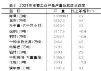 从主要工业产品产量看,全区原煤产量103896.1万吨,比上年增长2.7%;焦炭产量4657.9万吨,增长9.8%;发电量5952.6亿千瓦小时,增长3.7%。钢材产量2957.6万吨,下降0.9%;铝材产量240.1万吨,增长7.7%;乳制品产量368.0万吨,增长9.3%。