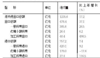 全年海关进出口总额1235.6亿元(人民币,下同),比上年增长17.2%。其中,出口总额478.4亿元,增长37.1%;进口总额757.2亿元,增长7.4%。从主要贸易方式看,一般贸易进出口额805.9亿元,增长16.8%,占进出口总额的比重为65.2%;边境小额贸易进出口额205.4亿元;加工贸易进出口额67.8亿元。与“一带一路”沿线国家进出口总额717.3亿元,比上年增长13.2%。