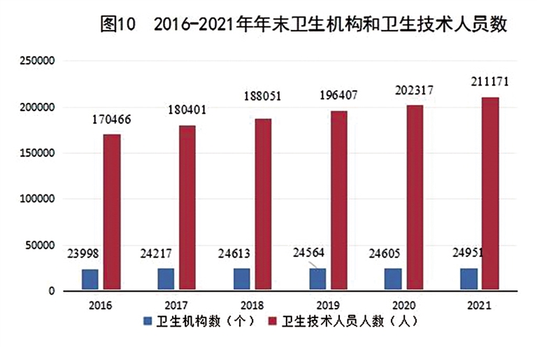 年末全区共有卫生机构24951个,其中医院806个,农村牧区卫生院1251个,疾病预防控制中心122个,妇幼卫生机构114个,专科疾病防治院(所)14个。年末全区医疗卫生单位拥有病床16.7万张,比上年增长2.8%。其中,医院拥有病床13.4万张,乡镇卫生院拥有病床2.1万张,妇幼卫生机构拥有病床0.4万张。全区拥有卫生技术人员21.1万人,增长4.4%。其中,执业医师、助理医师8.4万人,注册护士8.9万人。农村牧区拥有村卫生室1.3万个,拥有乡村医生和卫生员1.3万人。