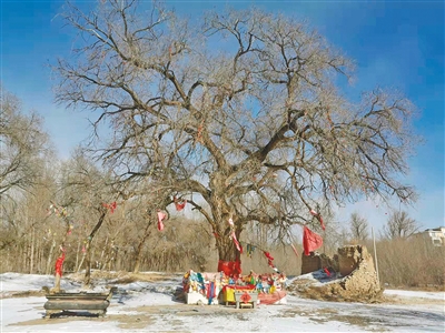遗址前,一棵树冠庞大的老榆树巍然挺立,粗壮的树干需要两个成年人才能环抱得住,树上的五彩经幡在蓝天白云的映衬下分外醒目。它的树龄已达250多岁,人称“神树”。