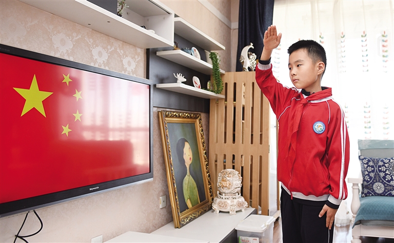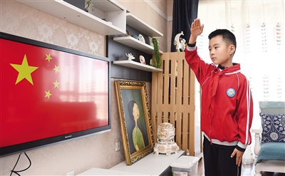 3月1日,呼和浩特市赛罕区金桥小学学生在线上升国旗仪式中行队礼。当日,呼和浩特市中小学如期开学,启动线上教学模式。为深入践行社会主义核心价值观,铸牢中华民族共同体意识,全市中小学在线上开展了共上“开学第一课”主题教育系列活动,进一步增强全市广大青少年“扣好人生第一粒扣子”的自觉性和主动性。本报记者 王磊 摄