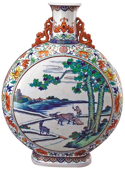 特点:仿古铜器扁壶形制,小口,直颈,溜肩,扁圆腹,椭圆形圈足。双夔龙连接颈肩形成双耳,口沿外部绘一周如意云头纹,颈部则绘蝙蝠作饰。腹部两面青花开光,用斗彩绘江南农耕场景,分别为耕地和耙耨两个画面。一面绘一农夫站在方形耙上,扬鞭驱牛;一面绘一农夫握犁执鞭,赶牛犁地。近有梧桐丛树,阡陌相交,配置得当;远有山丘绿林,青山绿野,农舍隐现,春意盎然。壶侧用斗彩绘勾莲纹,间绘蝙蝠、莲花、如意、万寿、编磬纹饰。足内青花楷书“大清乾隆年制”六字三行方款。