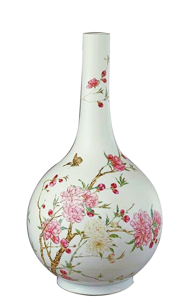 特点:直颈瓶式样典雅,亭亭玉立,于莹白温润之釉面上绘桃花绽放图。一株枝干遒劲的桃花,蔓遍器身,鲜花婀娜,雪白娇红,粉嫩怡人;花蕾待放,娇艳欲滴;绿叶青翠,点缀其间;彩蝶飞舞,春意盎然。胭脂红彩描绘的花朵颜色深浅不同,花心部分色料最厚,从花心到花瓣边沿红色渐趋浅淡。花瓣绿叶似有反侧,尽显春风中摇曳俯仰之姿。外底署青花楷书“大清雍正年制”双行六字款,外围青花双线圈。