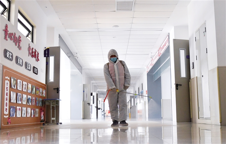 3月2日,呼和浩特市第三十中学工作人员正在对教学楼进行消杀。疫情防控期间,呼和浩特市第三十中学为切实保障师生健康,开展校园全方位消杀工作,做到全覆盖、高质量、无死角,为广大师生返校营造健康安全的校园环境。 本报记者 孟和朝鲁 摄