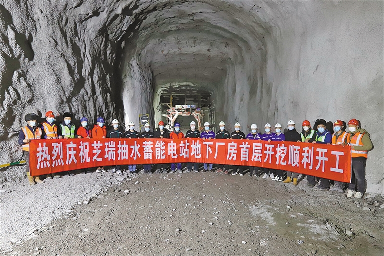 作为蒙东地区首座抽水蓄能电站,该电站项目为大(Ⅰ)型一等工程,总装机容量1200MW,安装4台单机容量300MW可逆式水泵水轮机组,电站主要由上水库、输水系统、地下厂房、下水库及地面开关站等建筑物组成。电站于2019年8月20日开工建设,目前已进入主体工程施工阶段,芝瑞电站地下厂房长166米、宽24米、高54.5米,采用钻爆法进行施工,开挖跨度大,地质条件比较复杂。施工开始前,国网新源内蒙古芝瑞抽水蓄能电站多次邀请国内知名专家对厂房设计方案和开挖方案进行评审,对设计图纸及专项施工组织设计进行细致研究,对厂房开挖施工的重点和难点以及施工过程中可能遇到的各种问题进行深入分析,确定了“中导洞先行,两侧扩挖跟进”的施工方案。