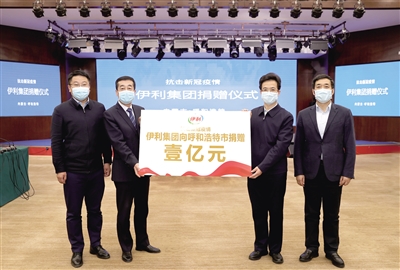 本轮疫情发生后,伊利是第一家向呼和浩特进行捐赠的企业。在抗击疫情最关键的时候,伊利人勇做志愿者,奔赴在捐助一线,用实际行动诠释企业大爱。在社区,伊利捐赠的爱心产品温暖着首府人的心,也坚定了大家的抗疫信心;在街头,伊利捐赠的核酸检测方舱为医护人员提供安全、温暖的守护;在抗疫一线,伊利捐赠的爱心物资为抗疫人员保驾护航,全方位助力呼和浩特抗击疫情。