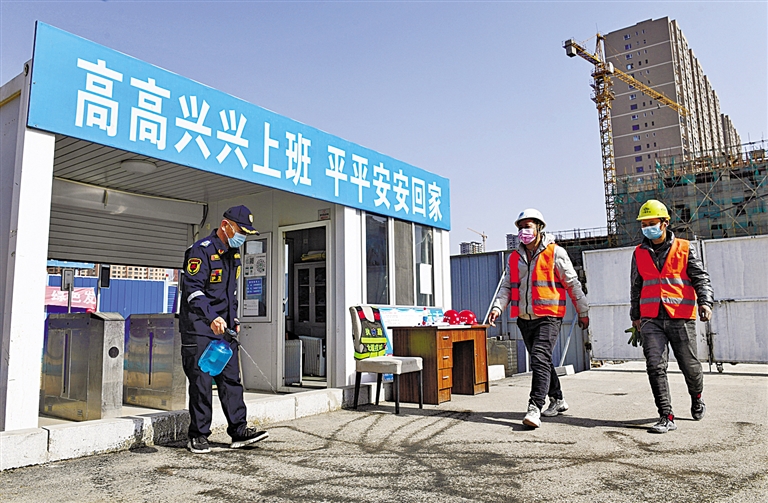 3月11日,工作人员在建筑工地入口处进行消杀。3月9日起,中建三局中央民族大学附属中学呼和浩特分校项目150余名施工人员分批返岗复工,项目部在做好疫情防控工作的同时,有序推进项目复工复产。