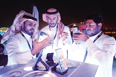 3月13日,在沙特阿拉伯首都利雅得,人们在OPPO新品发布会的活动场地内体验新产品。中国智能手机制造商OPPO于13日在沙特阿拉伯首都利雅得举办产品发布会,在中东地区首次发布全新“Reno7”系列5G手机。