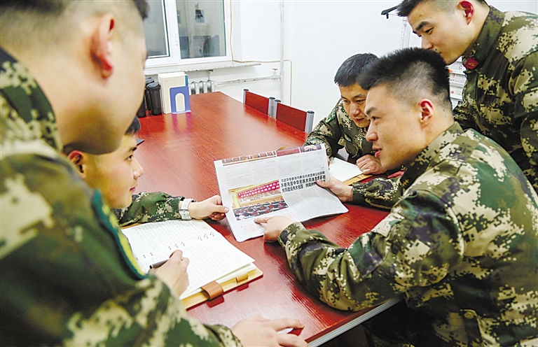 武警呼和浩特支队警卫勤务中队官兵认真学习习近平总书记参加十三届全国人大五次会议内蒙古代表团审议时的重要讲话精神。大家纷纷表示,要把重要讲话精神落实到一言一行,用忠诚筑牢祖国北疆安全稳定屏障。本报记者 安寅东 摄