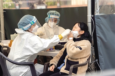 3月16日,医务人员在韩国首尔一处新冠病毒检测点为检测者取样。韩国中央防疫对策本部16日通报,截至16日零时,韩国单日新增新冠确诊病例超过40万例,创下该国疫情以来单日新增确诊病例数新高。