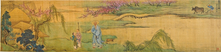 这幅人物风景画,图中主人翁是位年近花甲的朝廷命官,他头戴草帽,右手拈须,左手向背,站在河沿正视前方,一旁两童侍立,一人持杖,一人背书卷。背后是一派春意盎然、农事正忙的景象。这种用背景烘托人物的绘画手法,即将人物置于特定的时节和环境中,用以展现主人公其时的活动和生活环境,反映他们的行为举止和思绪心态,正是禹之鼎人物画的特点。